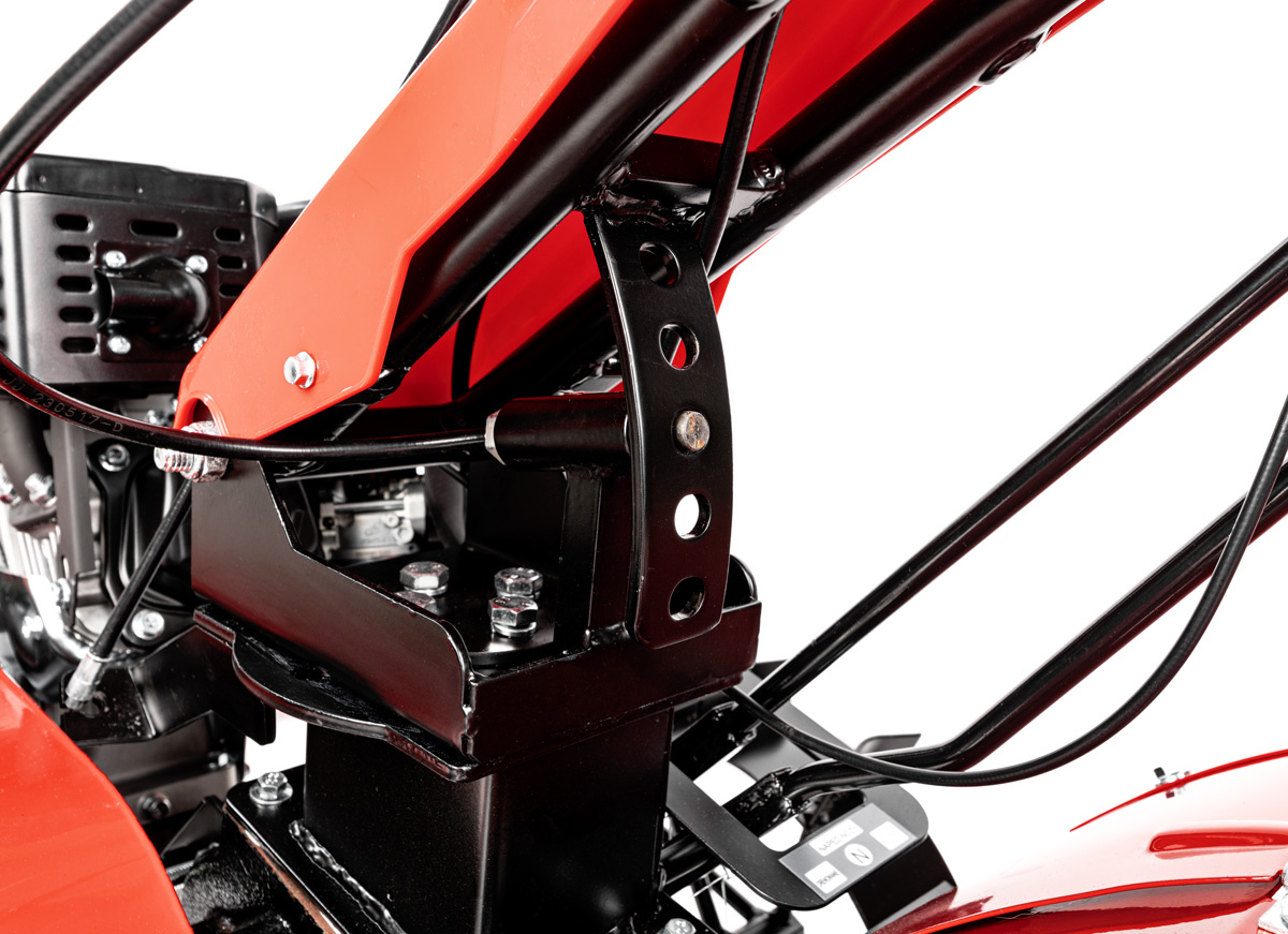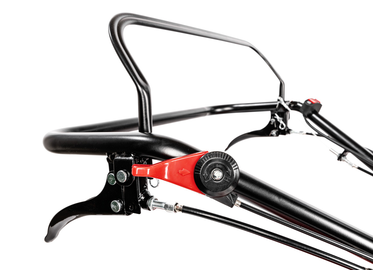 Regulowany uchwyt oraz koła transportowe ułatwiają sterowanie maszyną i przemieszczanie jej po terenie. Miękkie wykończenie rączek zwiększa komfort nawet podczas długotrwałej pracy.