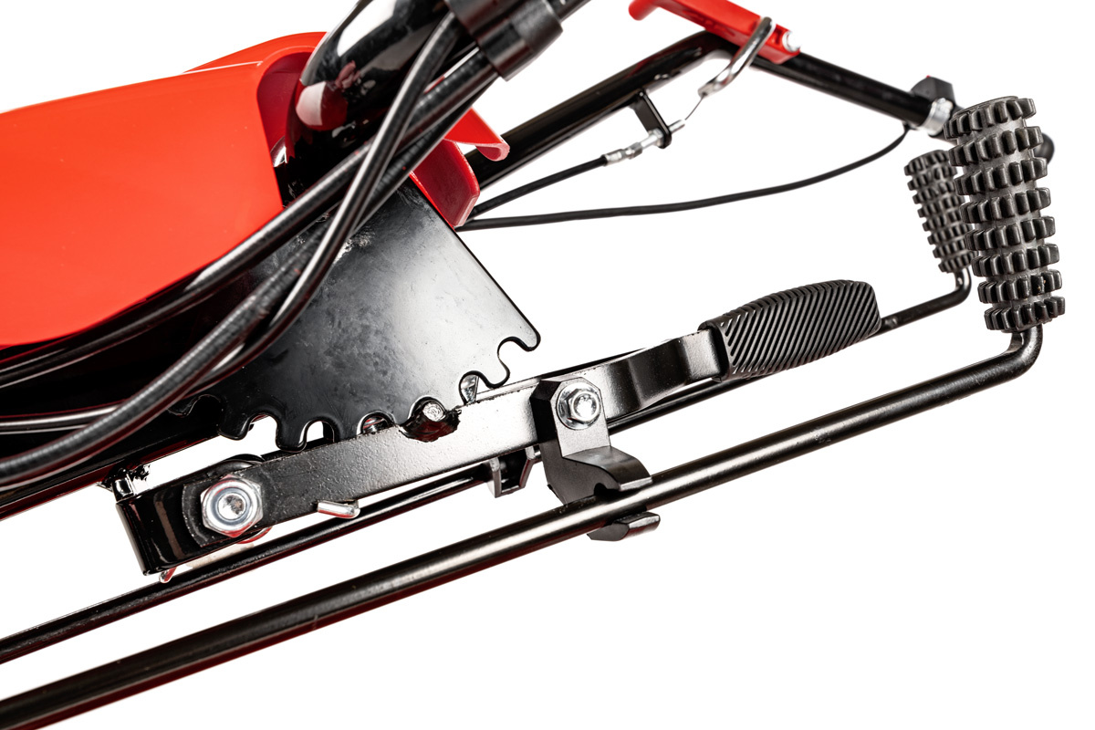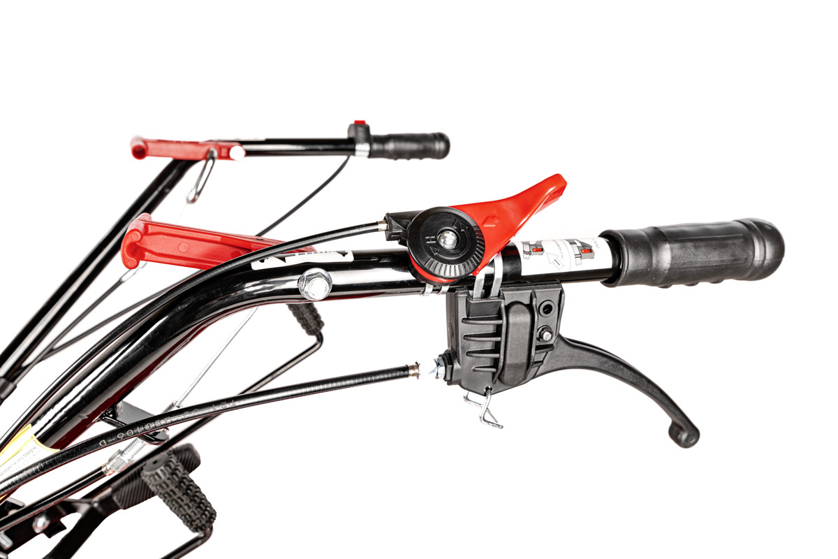 Koła transportowe ułatwiają przemieszczanie maszyny, a regulowany uchwyt i ergonomiczne rączki zapewniają komfort pracy dopasowany do wzrostu operatora.