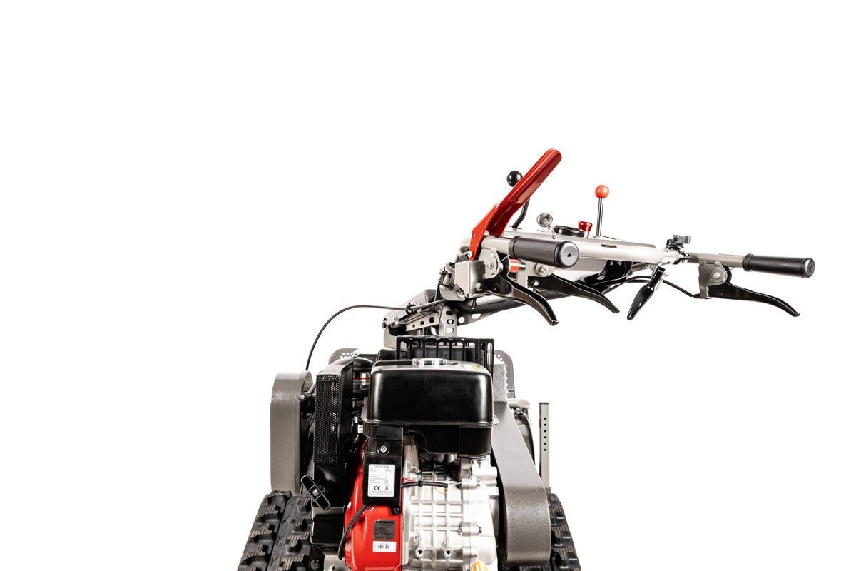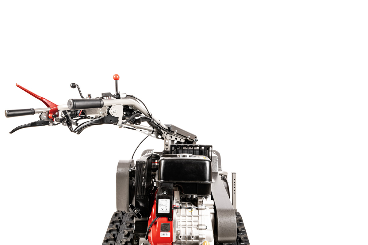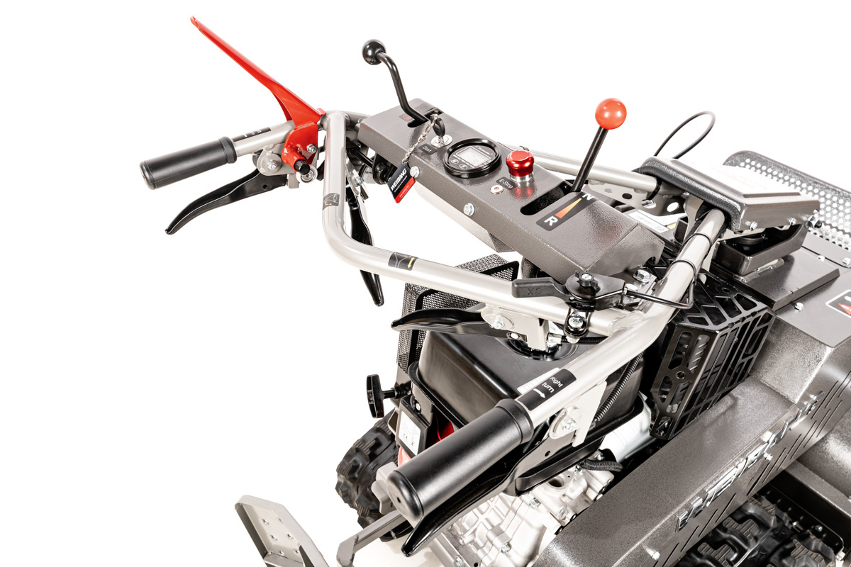 Zintegrowany panel sterowania zawiera uchwyty do regulacji przepustnicy silnika, zmiany biegów oraz włączania i wyłączania wirnika tnącego, co pozwala operatorowi w pełni kontrolować pracę kosiarki.