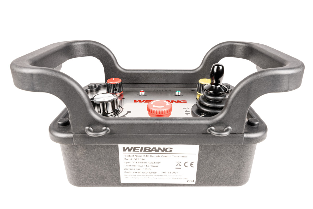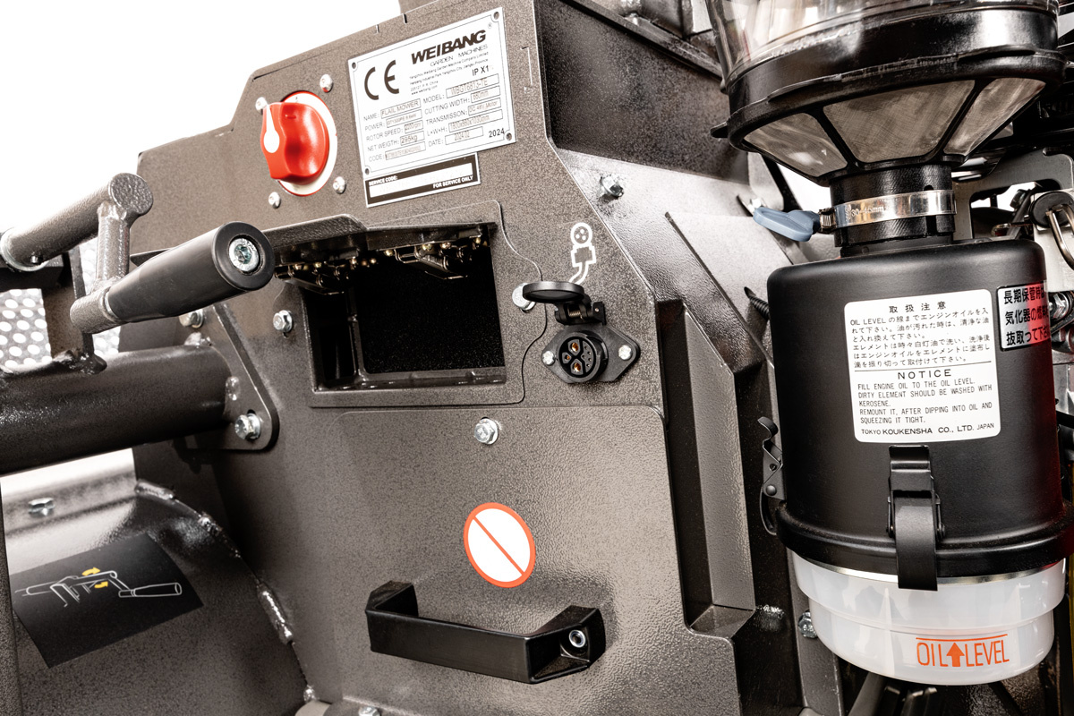 Panel sterowania kosiarki bijakowej Weibang WBGT6813 został wyposażony w uchwyty umożliwiające regulację przepustnicy silnika, zmianę biegu przekładni oraz włączanie i wyłączanie noży bijakowych. Dzięki temu użytkownik może łatwo dostosować prędkość silnika i bieg do warunków terenowych oraz rodzaju koszonej roślinności, zapewniając maksymalną wydajność i bezpieczeństwo pracy.