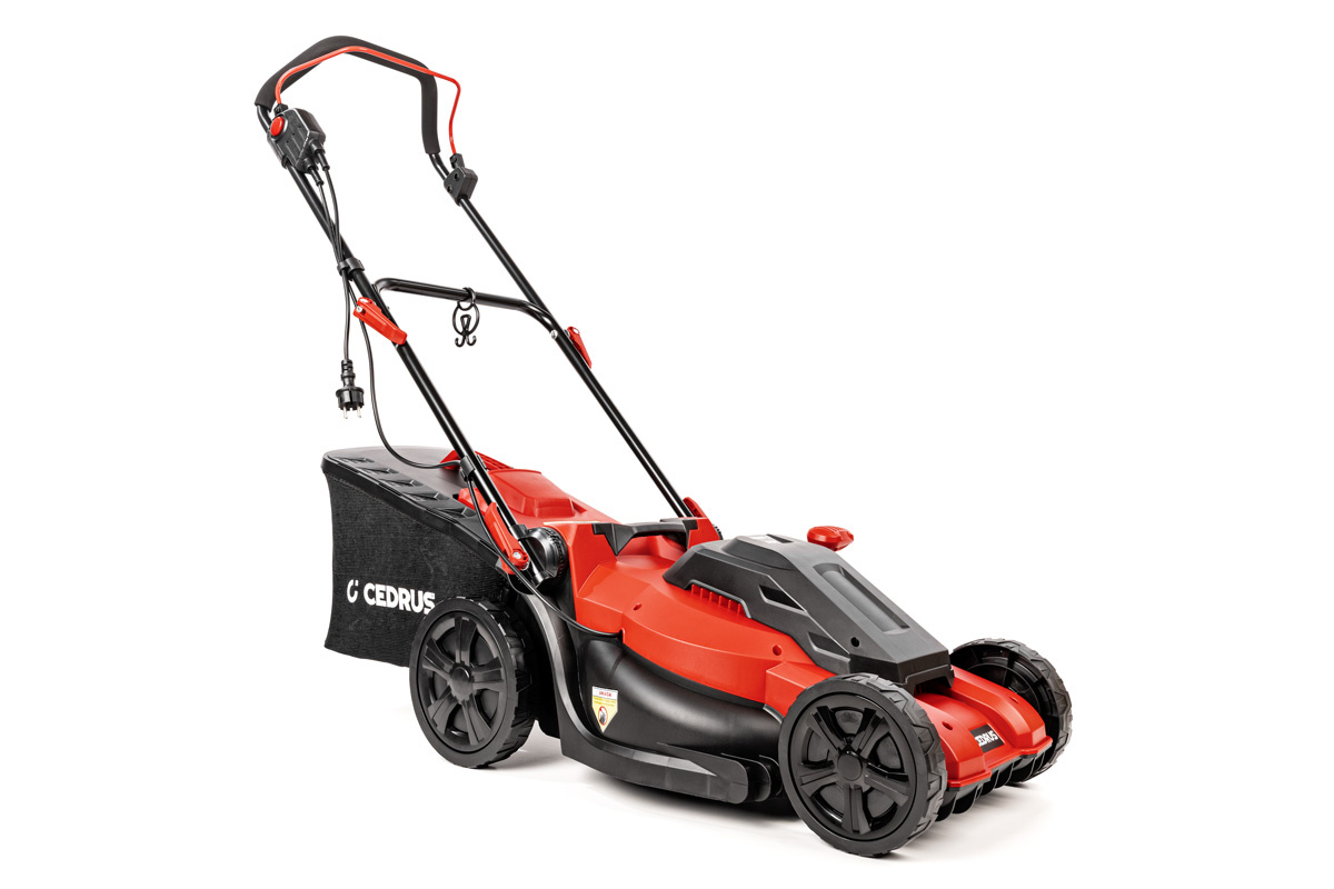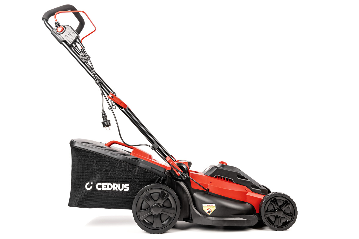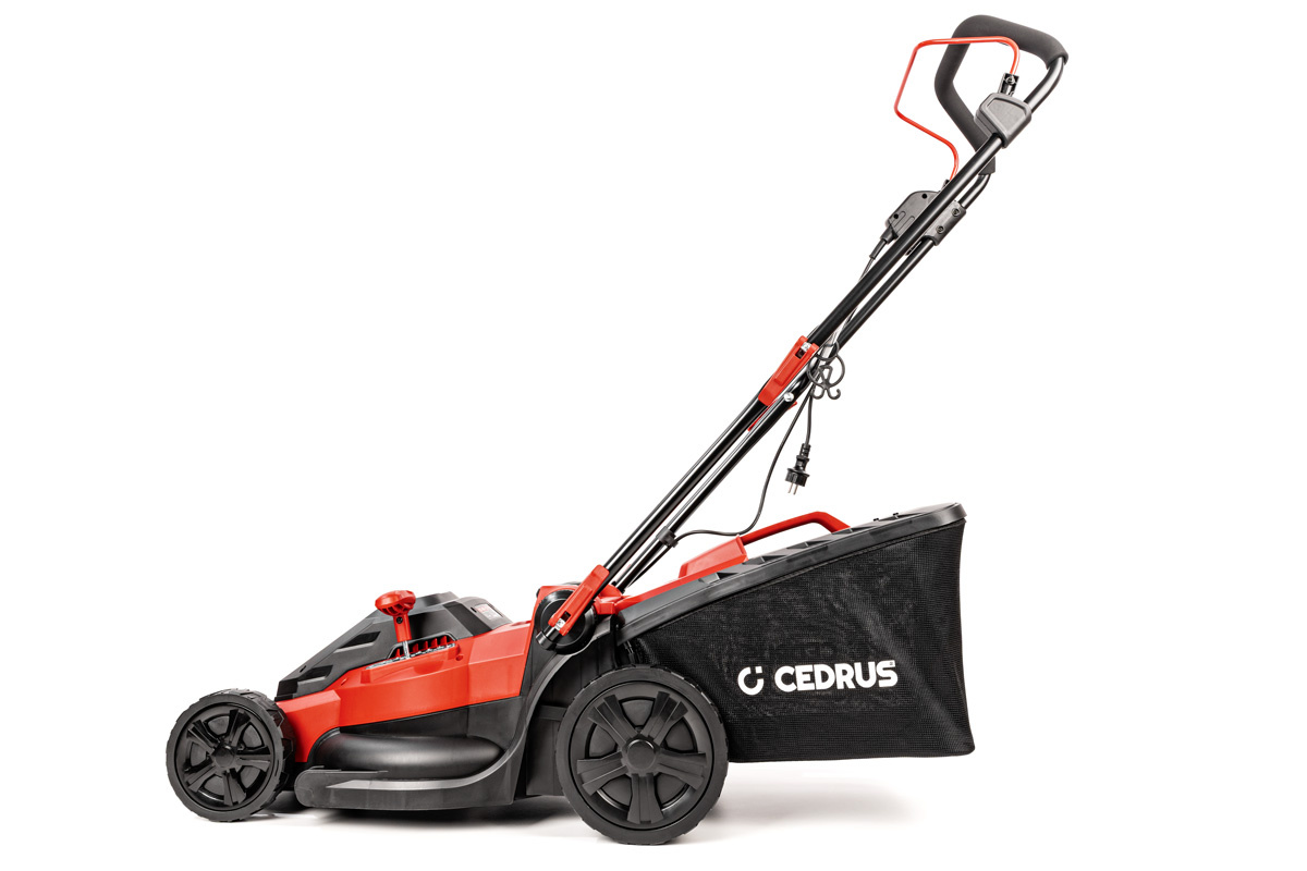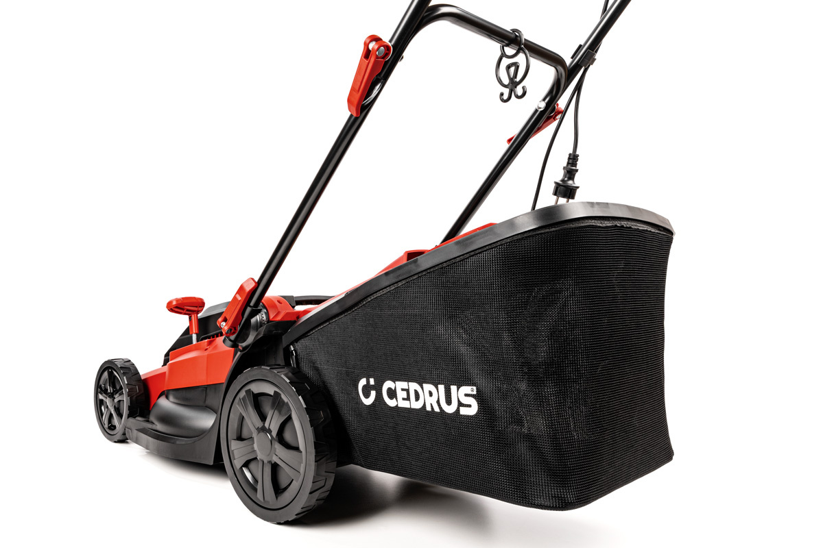 - Kosiarka elektryczna **Cedrus KE40** o mocy 1800 W i szerokości koszenia 40 cm zapewnia wydajną i komfortową pracę. Wyposażona w centralną regulację wysokości koszenia (25–70 mm) oraz kosz o pojemności 45 litrów.