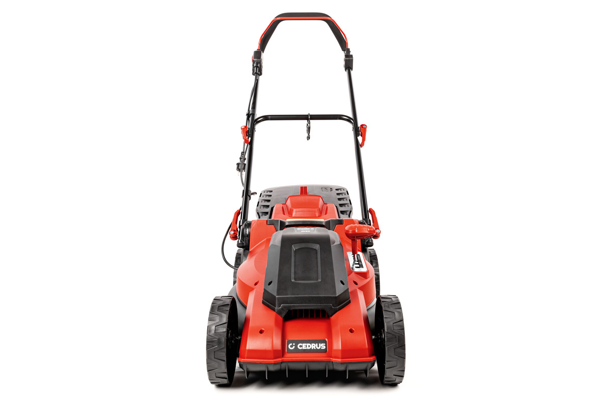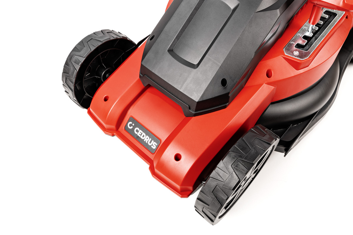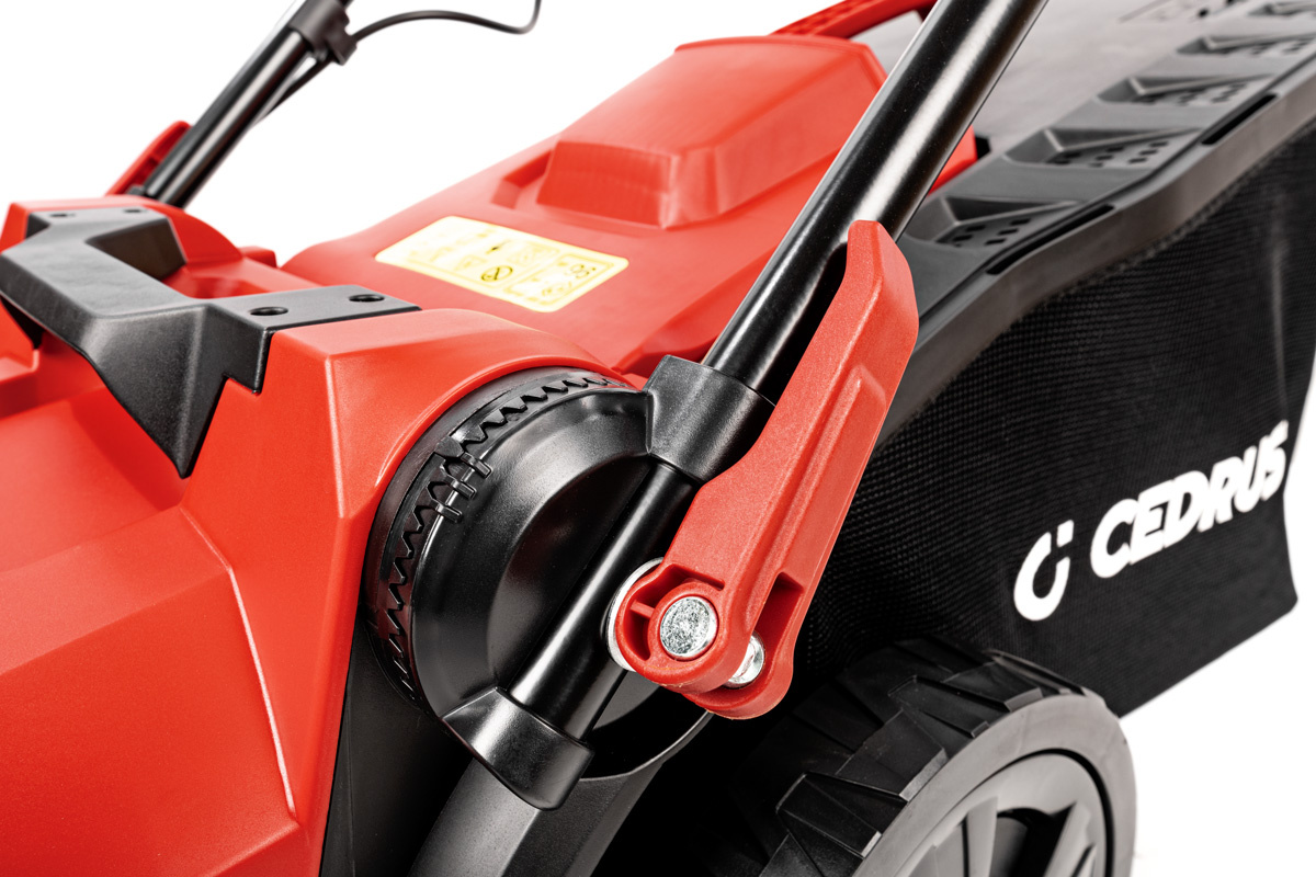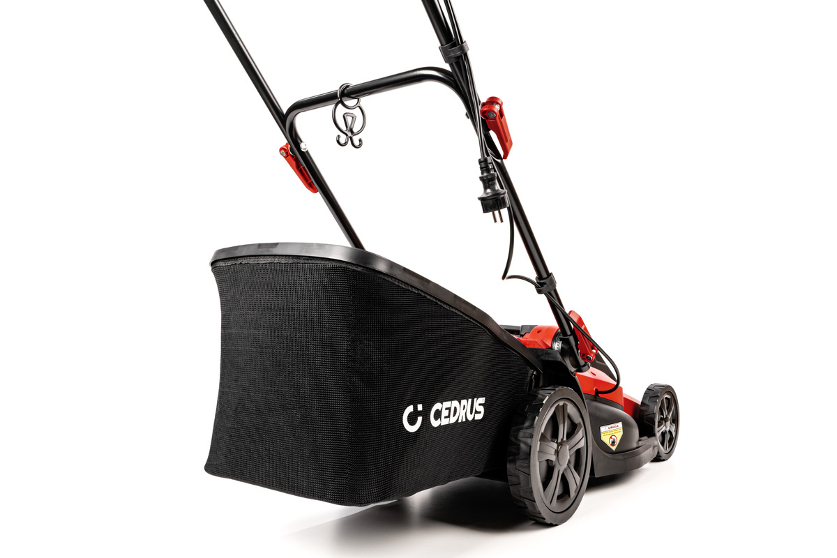 - Kosiarka elektryczna **Cedrus KE40** o mocy 1800 W i szerokości koszenia 40 cm zapewnia wydajną i komfortową pracę. Wyposażona w centralną regulację wysokości koszenia (25–70 mm) oraz kosz o pojemności 45 litrów.
