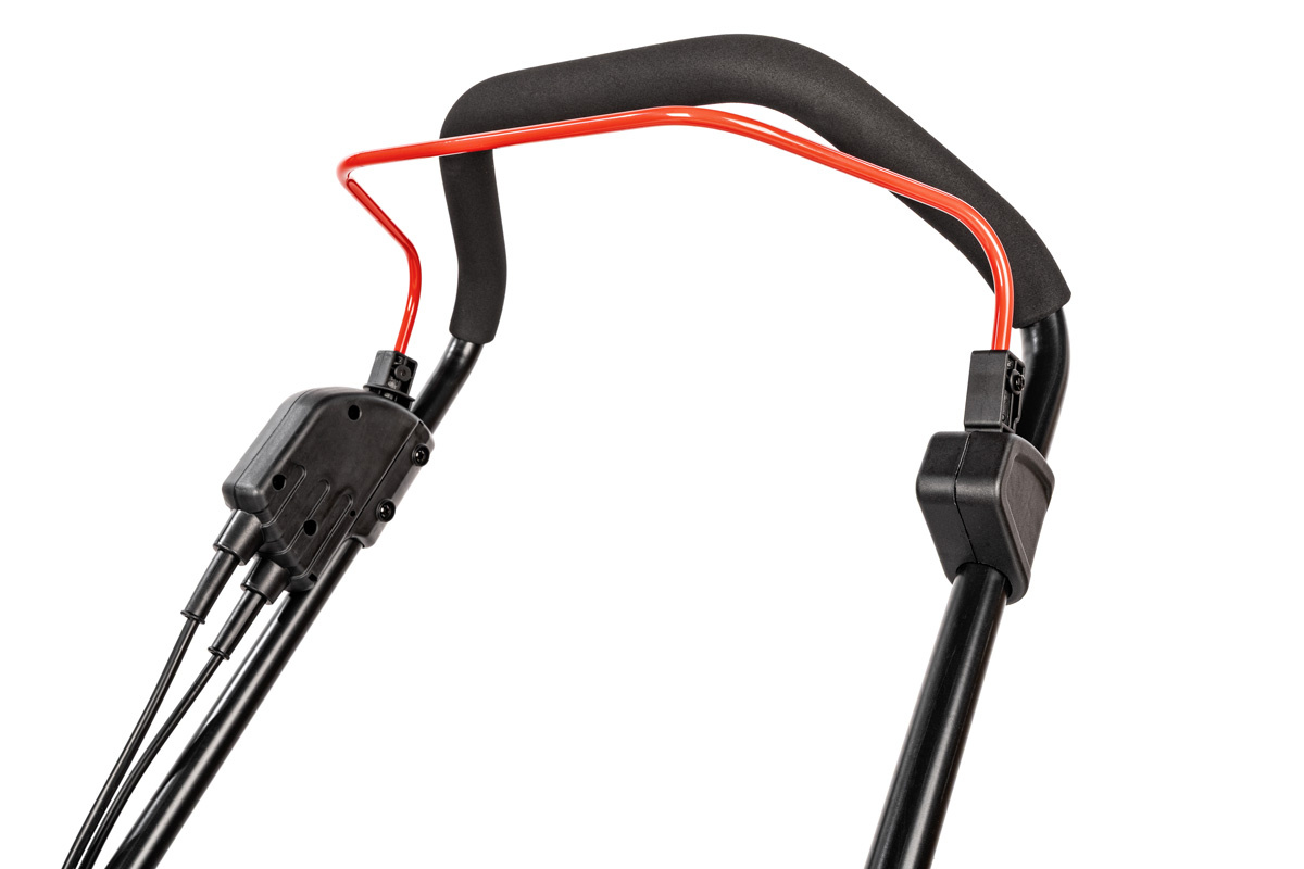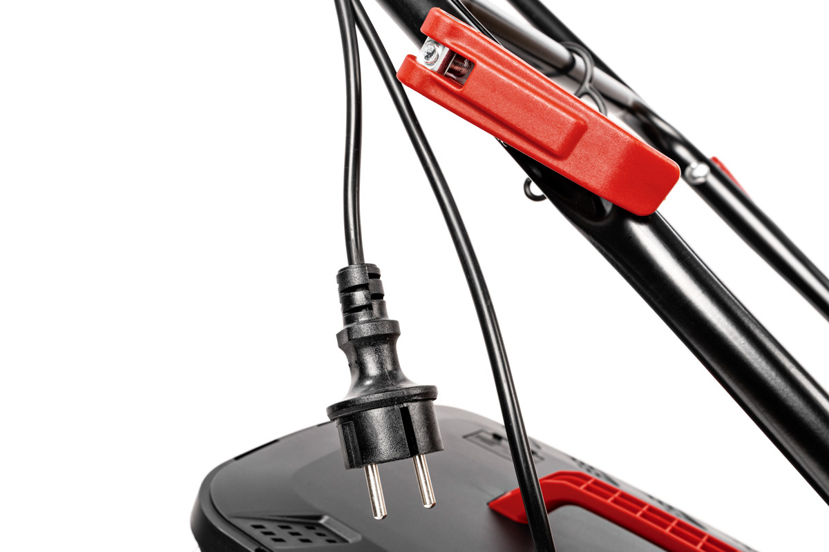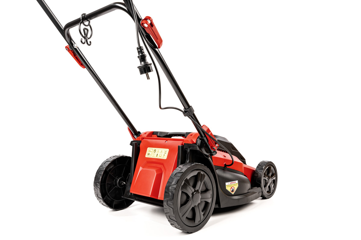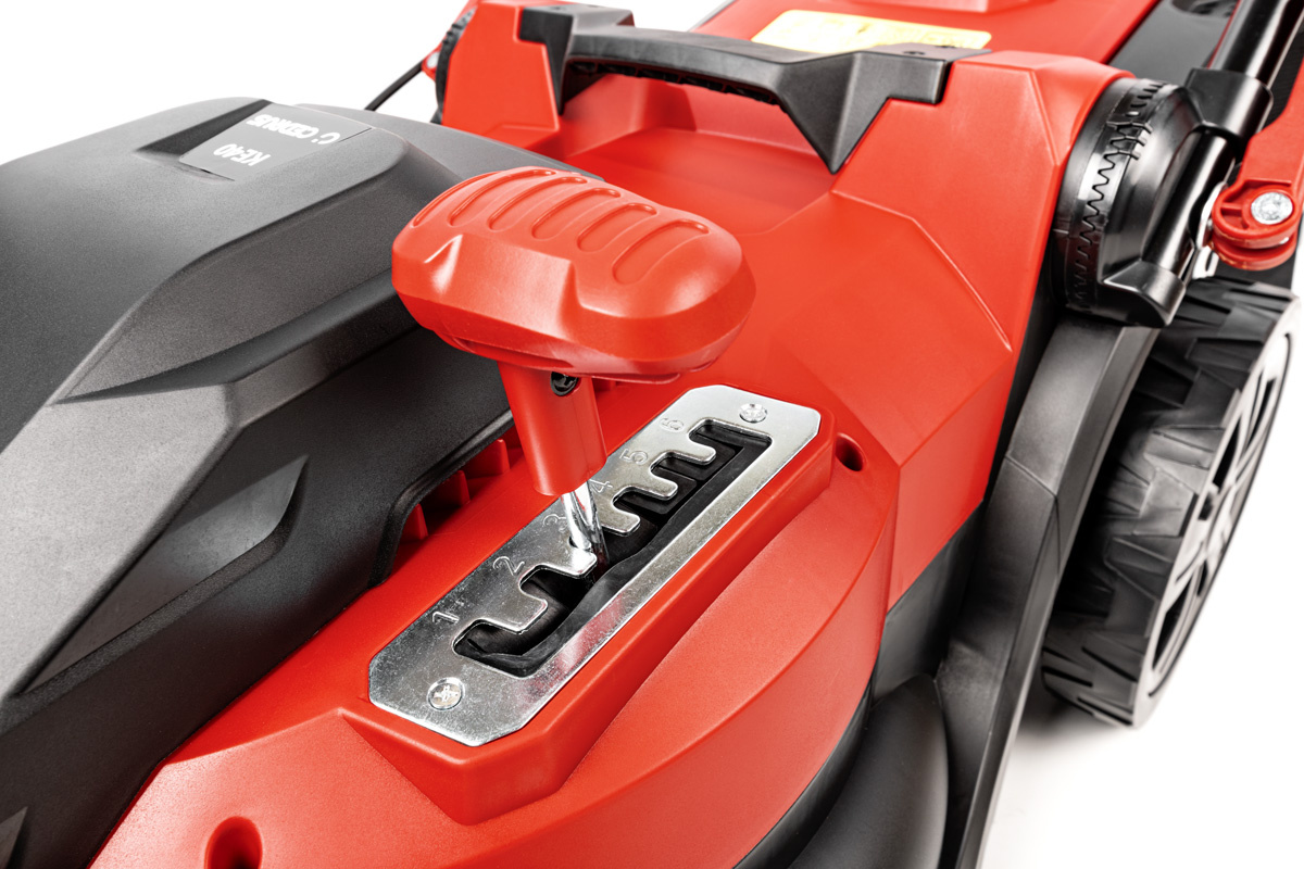 Silnik elektryczny o mocy 1400 W zapewnia kosiarkę o wysokiej wydajności, niezawodności i stabilnej pracy. Uruchomienie jest bardzo proste – wystarczy przytrzymać dźwignię gazu i nacisnąć przycisk "START", a urządzenie świetnie radzi sobie również na pochyłych terenach.
