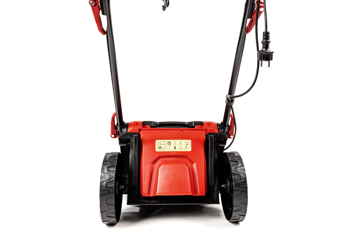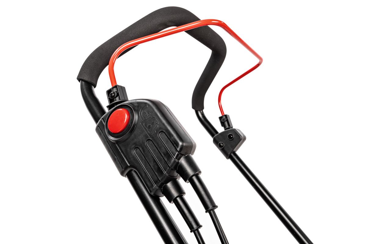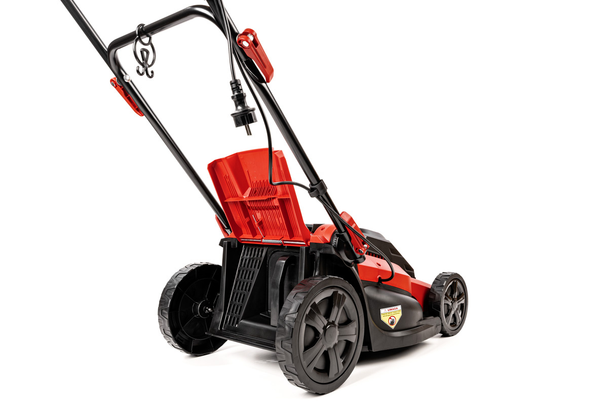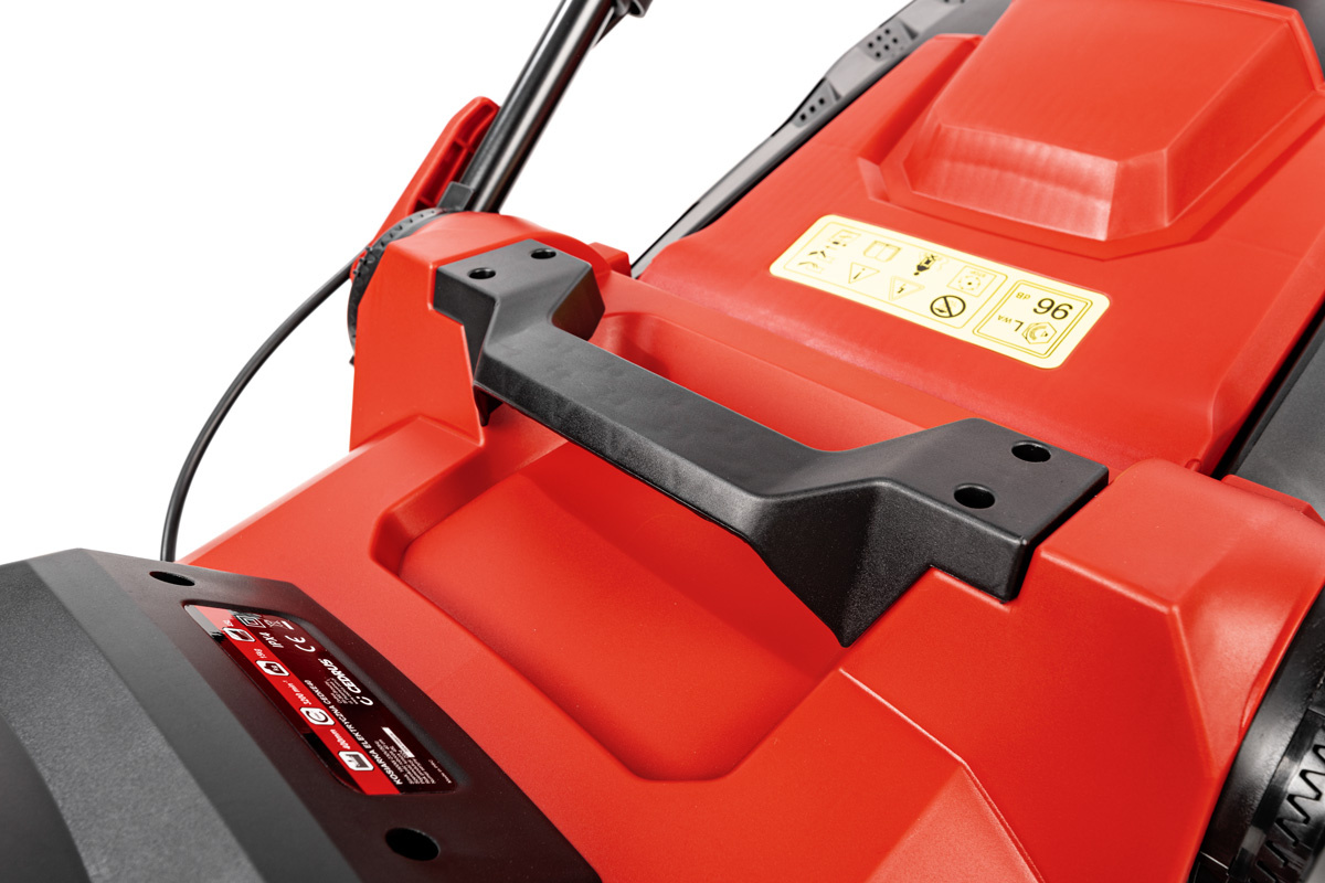 Silnik elektryczny o mocy 1400 W zapewnia kosiarkę o wysokiej wydajności, niezawodności i stabilnej pracy. Uruchomienie jest bardzo proste – wystarczy przytrzymać dźwignię gazu i nacisnąć przycisk "START", a urządzenie świetnie radzi sobie również na pochyłych terenach.