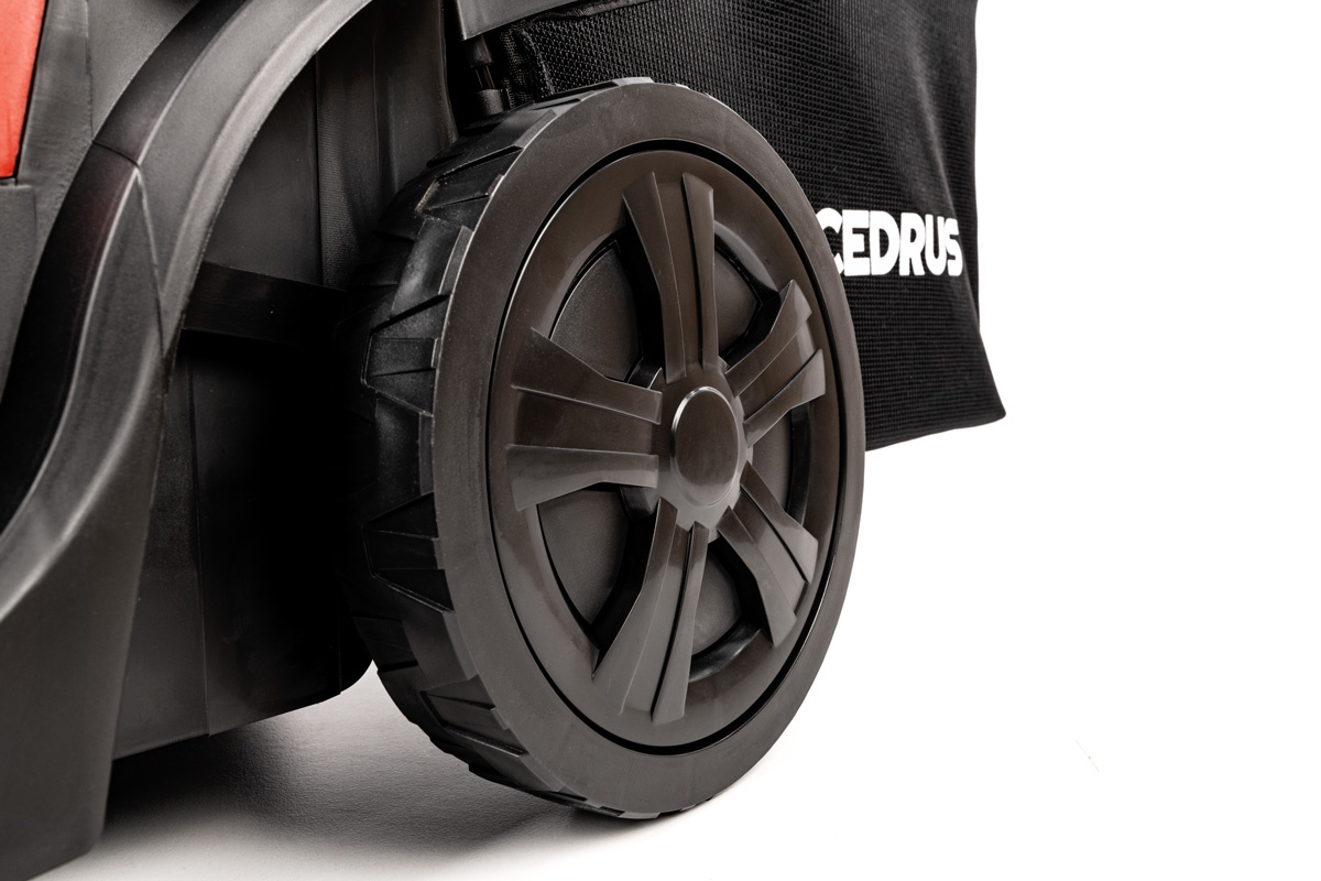 Kosiarka elektryczna Cedrus KE40 to duże i mocne urządzenie o mocy 1800 W i szerokości koszenia 40 cm. Wyposażona w kosz o pojemności 45 litrów ze wskaźnikiem napełnienia, centralną regulację wysokości koszenia (25–75 mm) oraz duże tylne koła, które ułatwiają prowadzenie kosiarki po trawniku i nierównym terenie.