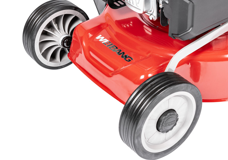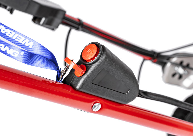 - Kosiarka spalinowa Weibang WB456SC VE 3IN1 została wyposażona w silnik o pojemności 166 cm³ oraz praktyczny elektryczny rozruch – wystarczy nacisnąć czerwony przycisk na uchwycie, aby uruchomić maszynę.