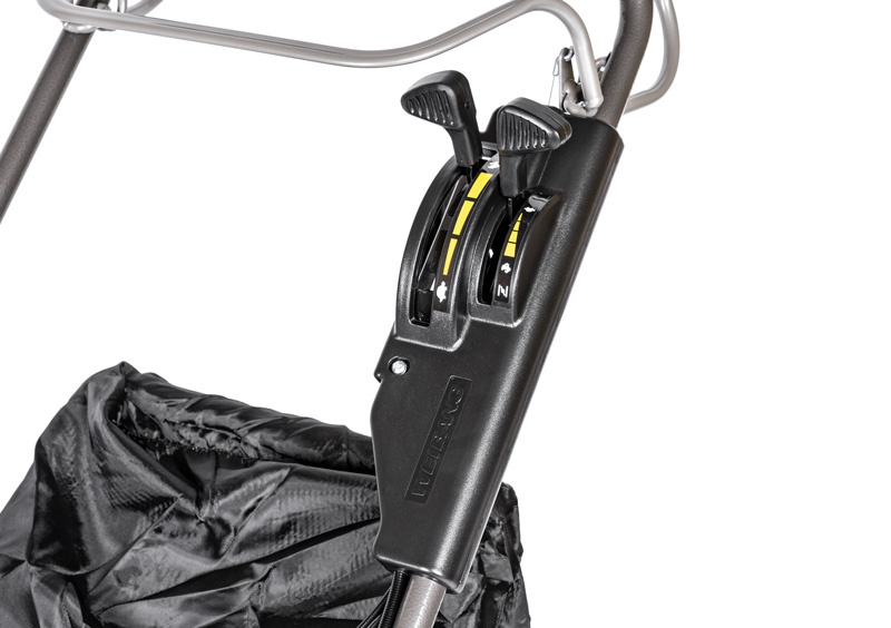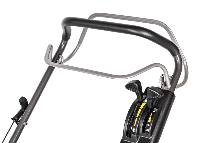 Dwustopniowo regulowany, składany uchwyt – ułatwia transport i przechowywanie kosiarki.