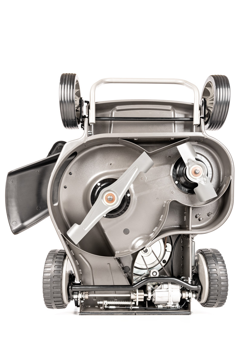 System podwójnych ostrzy z zakładką – szerokość koszenia 77 cm, nawet 45% większa wydajność względem modeli 53 cm